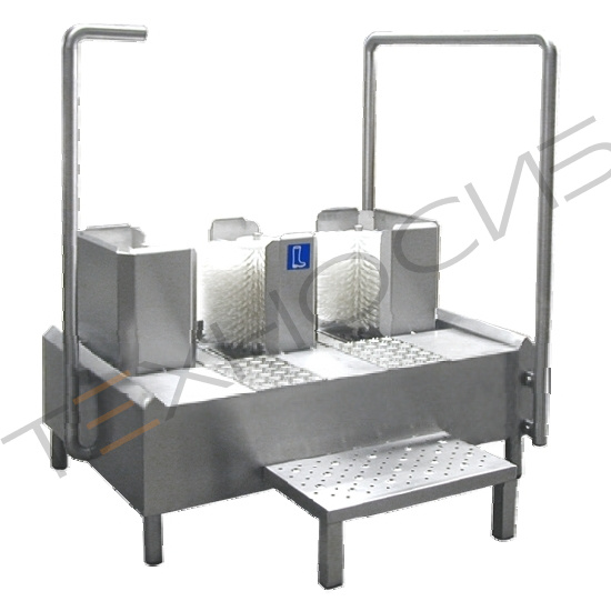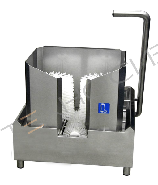 Одновременная мойка подошв, при помощи горизонтально расположенного, вращающегося щеточного валика, и голенищ сапог, при помощи вертикально расположен...