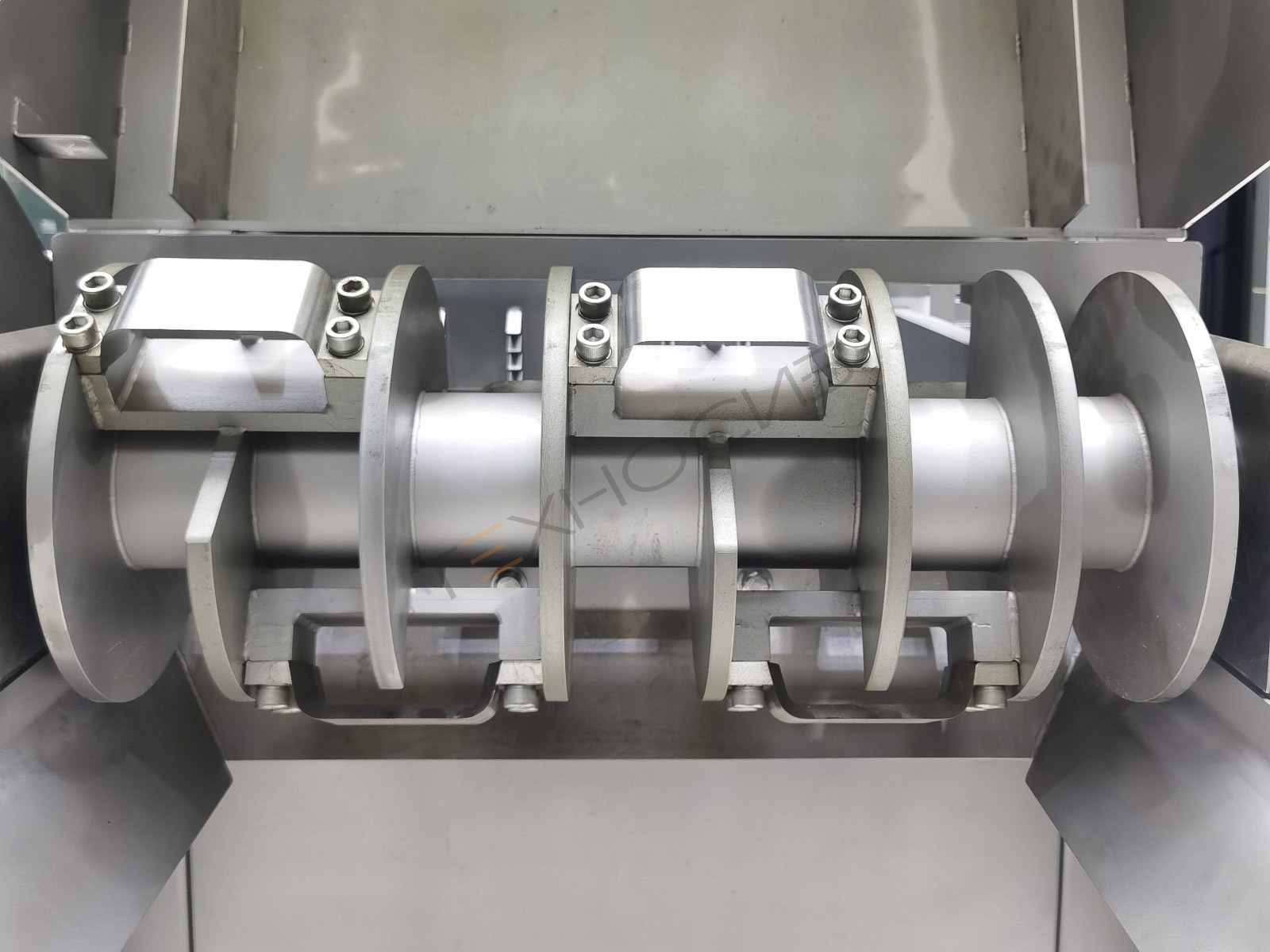 Узел измельчения в DRB-PR3000 включает ряд вращающихся ножей шириной 50 мм, выполненных из высокоуглеродистой легированной стали марки 9ХС. Эти ножи обеспечивают отличное качество заточки, устойчивость к коррозии и длительное сохранение режущей кромки. Сплав 9ХС отличается наличием карбидов, что способствует стабильности кромки и повышает прочность деталей. В зависимости от выбранных ножей, толщина измельчённого мяса может быть от 6 до 35 мм, что уточняется при заказе.